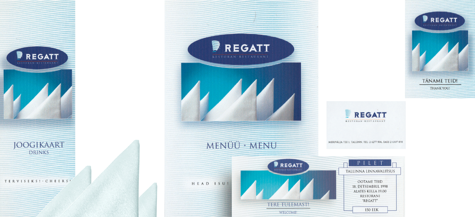 RegattVisual identity elements for restaurant REGATTA at the mouth of river Pirita, Tallinn, Estonia. From the beginning of 1990-ties.